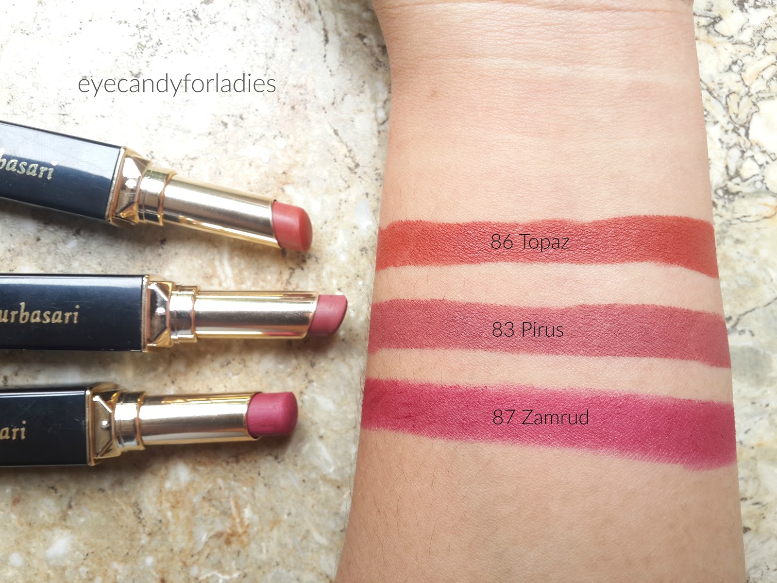Secara keseluruhan, 3 warna yang sudah dibahas sebelumnya adalah matte, namun tiap warna memiliki variasi matte yang berbeda satu sama lain; 83 Pirus terasa flat-matte, 86 Topaz terasa moisturizing matte sedangkan 87 Zamrud terasa dead-matte (matte yang membuat bibir terasa kering). Selain itu, 87 Zamrud memiliki partikel glitter yang sangat halus dan hanya bisa terlihat jika dilihat dibawah sinar matahari langsung; (mungkin) partikel glitter ini yang membuat 87 Zamrud terasa lebih kering dibanding 2 warna lainnya.